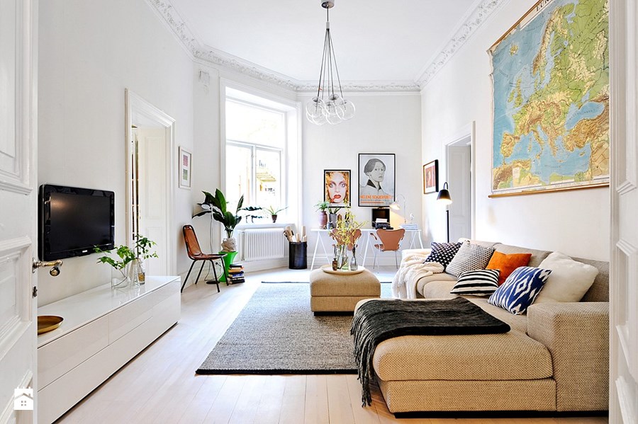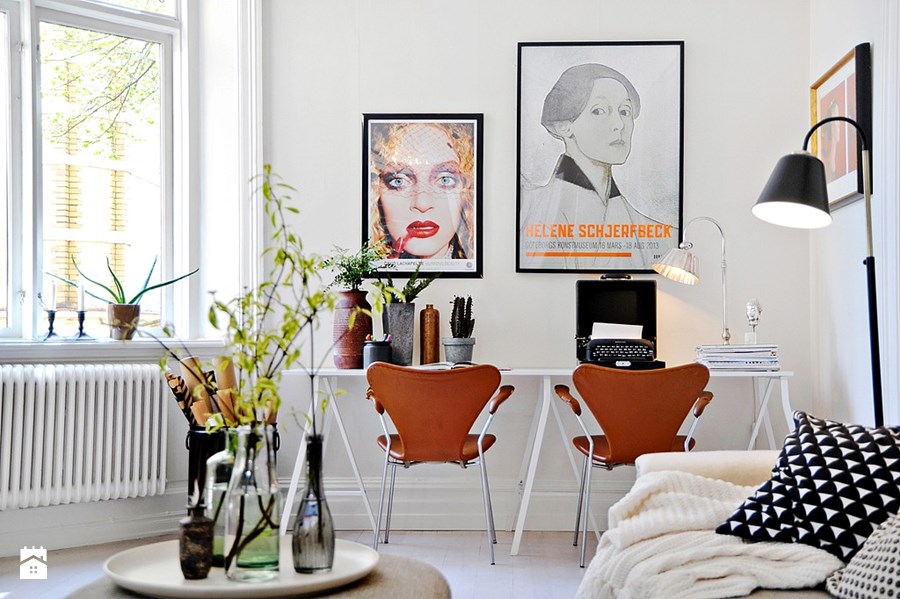 Pokój nie był taki najłatwiejszy w aranżacji, ponieważ ma nieregularny kształt, który jednak nieco ginie wobec takiej wysokości pomieszczenia. Dzięki temu aranżacja zachowuje harmonijny i przyjemny charakter. Ozdobna sztukateria zdecydowanie ją wzbogaca i nawet stanowi mały kontrast dla innych, pełnych lekkości elementów, np. wiszącej lampy zakończonej jakby bańkami powietrza 🙂 Po drugiej stronie salonu wygospodarowano świetny kąt do pracy i nauki, i to jeszcze z podwójnym stanowiskiem! Umiejscowienie tuż przy dużym oknie to strzał w dziesiątkę. Ten domowy gabinet swoim urządzeniem idealnie wpisuje się w wystrój całego wnętrza – na pierwszy rzut oka nie widać rozdziału pomiędzy tymi dwoma częściami pokoju.