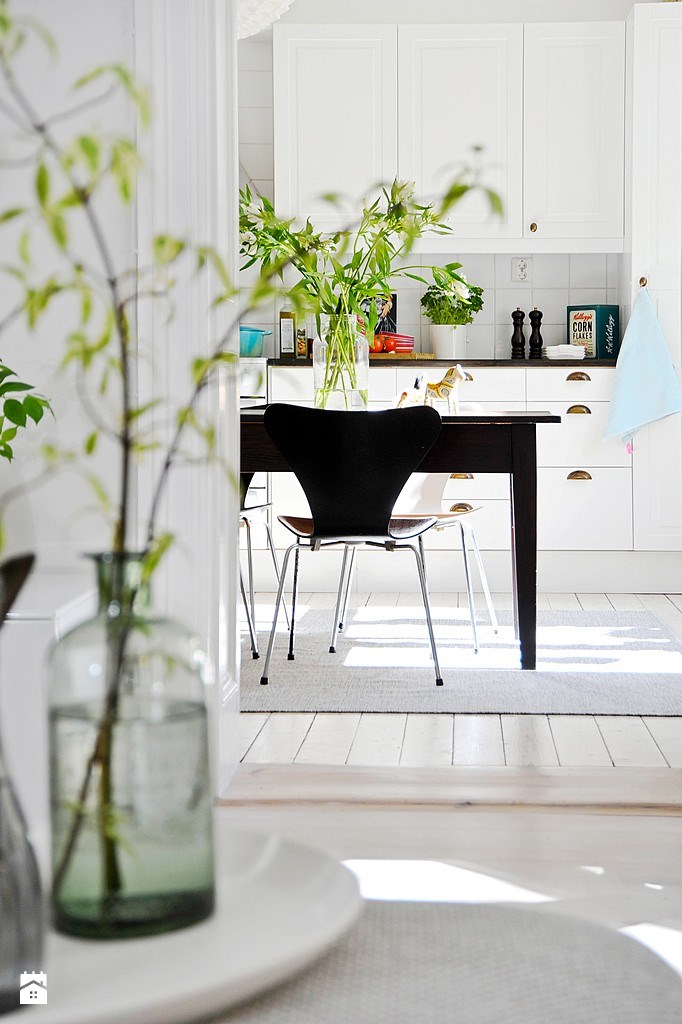Salon prowadzi do kuchni z jadalnią, przestronnego pomieszczenia pełnego światła – właśnie to rozświetlenie to, według mnie, największy atut całego mieszkania. Tym bardziej, że potęgują je bielone podłogi z drewna, białe meble i ściany i w pewnej części także dodatki. Jednocześnie dzięki zastosowaniu akcentów w mocniejszych, nasyconych, a nawet czarnych barwach, wnętrze zachowuje przyjemną dla oka harmonię.