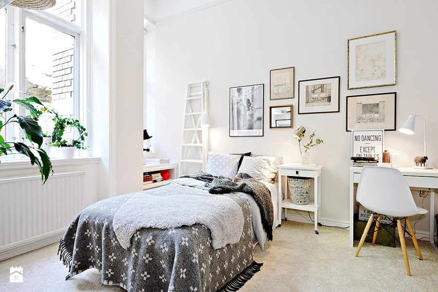 W drugiej sypialni przygotowano przestrzeń do nauki, a najciekawszym jego punktem jest antresola z dodatkowym miejscem do spania. Zauważcie, że mieszkanie ma przechodnie pokoje, w każdym wnętrzu znajdują się po dwie pary drzwi. To dodaje mu klimatu starych zabytkowych budowli, jakie stawiano jeszcze kilkadziesiąt lat temu 🙂