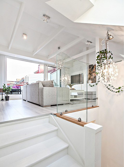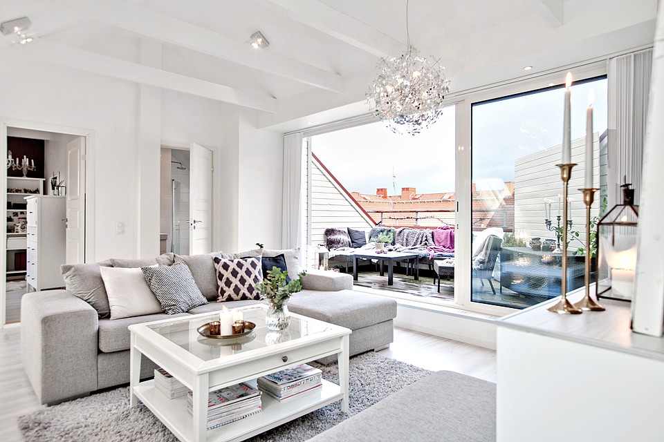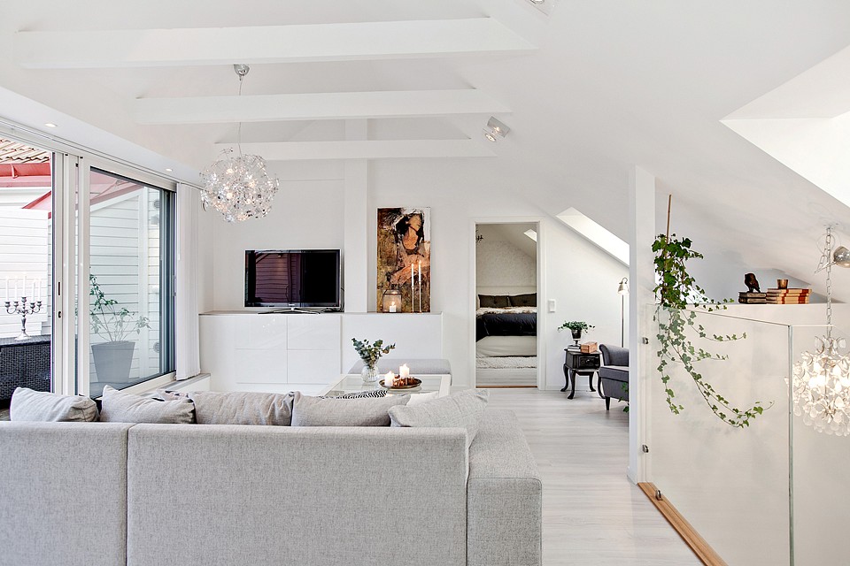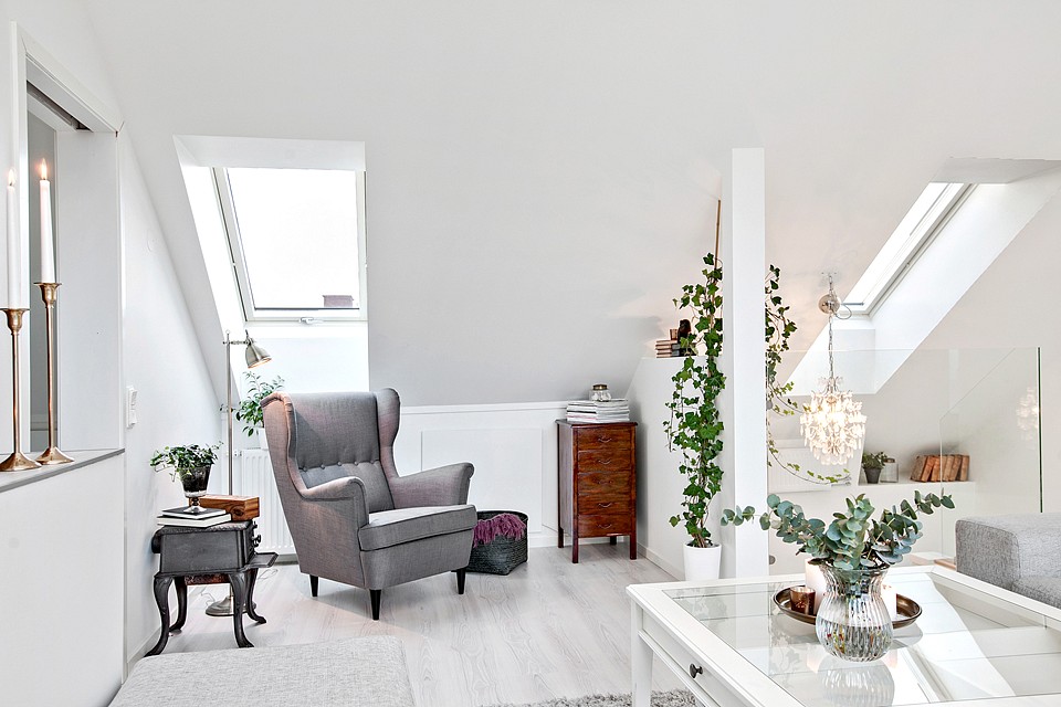 Jednym z największym atutów poddasza jest jego doświetlenie. Czasem trudno o dostateczną ilość światła naturalnego we wnętrzach pod skosami. W tym mieszkaniu jednak przestrzeń na poddaszu zdaje się być bardziej bogata we wszelkie okna niż poziom niżej 🙂 Wiele daje duże przeszklenie prowadzące na niewielki taras. Poza tym okna dachowe położone w bliskiej od siebie odległości zapewniają odpowiednią jasność. Zaaranżowano tutaj salon z kącikiem do czytania i sypialnię w osobnym pomieszczeniu. To świetne miejsce na wyciszenie się i nacieszenie oczu gustownym wystrojem. Również i na tym poziomie wyszukane dekoracje odgrywają pierwszorzędną rolę.
