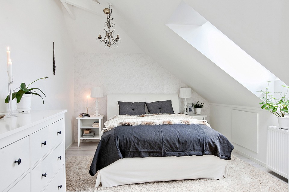 Sypialnia prezentuje się uroczo, ale też dość poważnie. Zdobiony żyrandol, klasyczne meble i kolory szlachetnej szarości tworzą naprawdę stylowe wnętrze. A widzicie delikatną tapetę z tłoczonym wzorem na ścianie za łóżkiem? Na pierwszy rzut oka jest prawie niewidoczna i dzięki temu subtelnie wzbogaca aranżację. W ten sposób sypialni można przypisać finezyjny charakter.