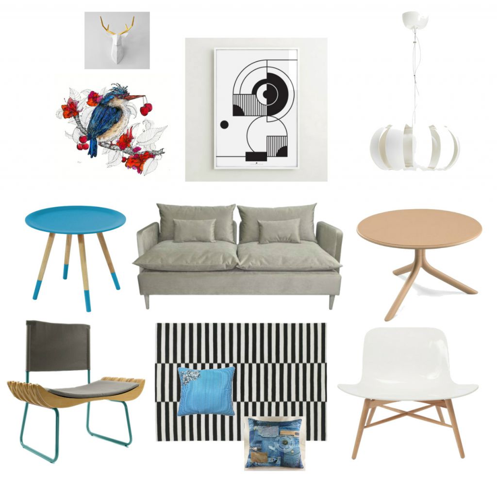 źródło: jelonek biało-złoty , ilustracja ptak niebieski , plakat czarno-biały ptak , lampa , stolik niebieski , sofa , stolik na trójnogu , fotel organic na płozach , dywan w paski , poduszka 1 , poduszka 2 , fotel biały