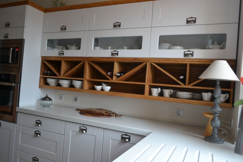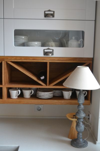 Można mieć nie tylko otwarte półeczki, ale też półotwarte w różnej formie. Moja mama na przykład zdecydowała się na trójkątne, które też świetnie nadają się do przechowywania wina:)