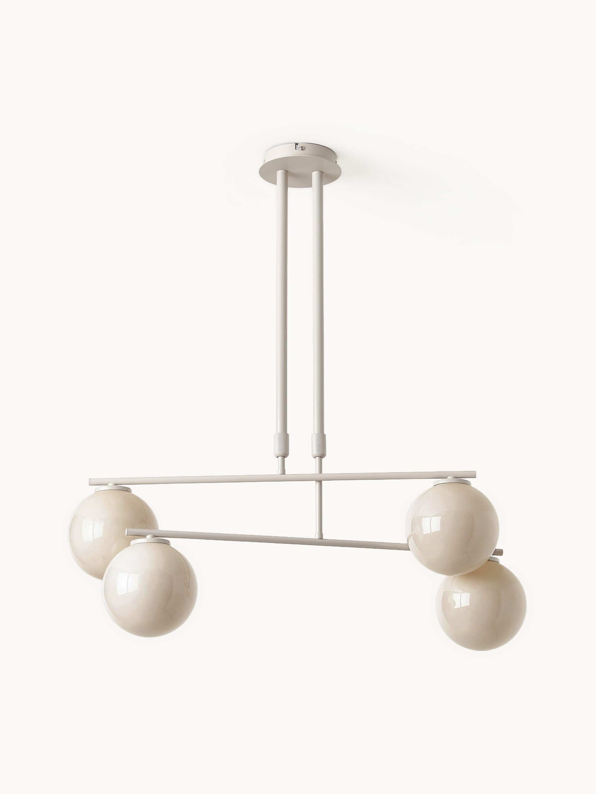 Elegancka lampa wisząca Atlanta ze szklanymi kloszami i metalowym stelażem od Westwing Collection — szklane klosze i metalowy baldachim tworzą efektowną, wielopunktową lampę do jadalni lub salonu.