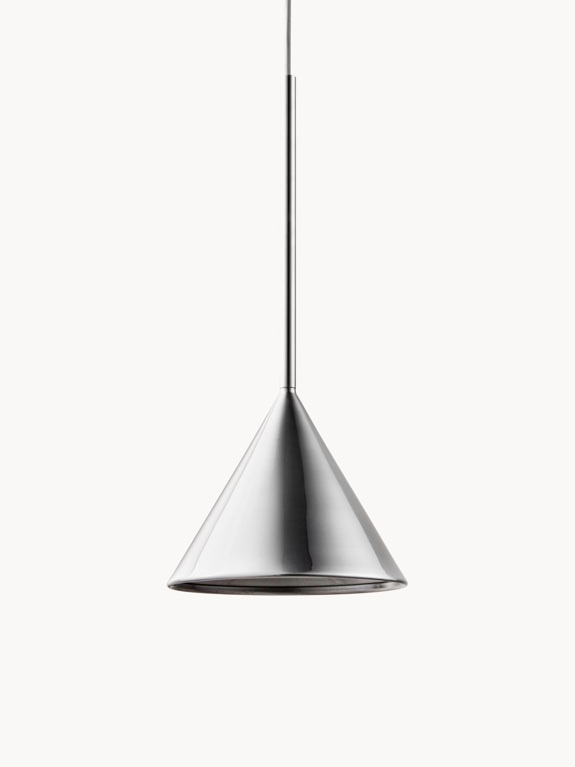 Mała ręcznie wykonana lampa wisząca Figura z aluminium to designerska, artisanal propozycja oświetleniowa. Aluminiowy klosz i tkaninowy kabel tworzą elegancką lampę wisząca o dopracowanych detalach.