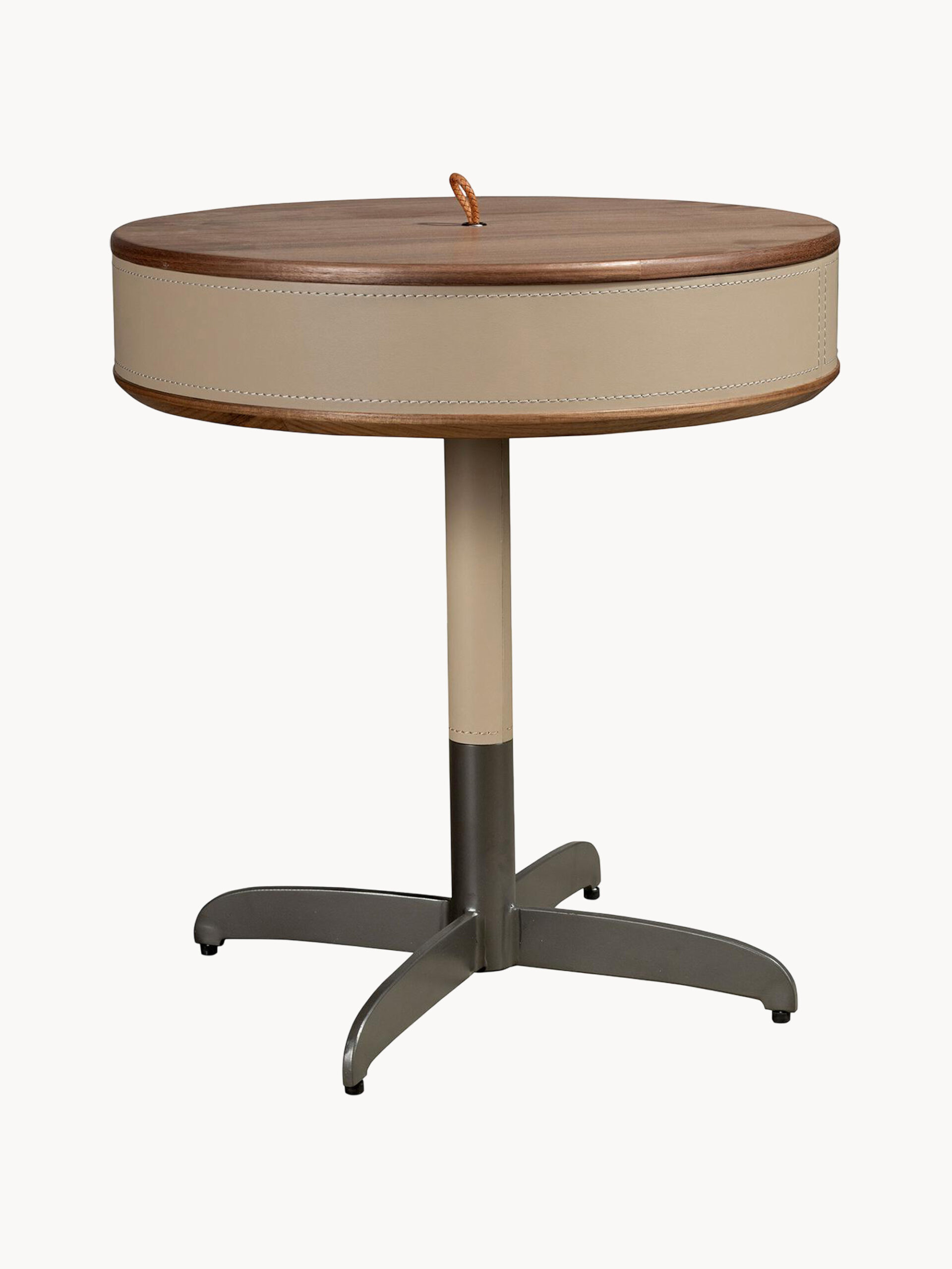 Materiał blatu i półki: drewno fornirowane naturalnym orzechem, stal nierdzewna, skóra bydlęca