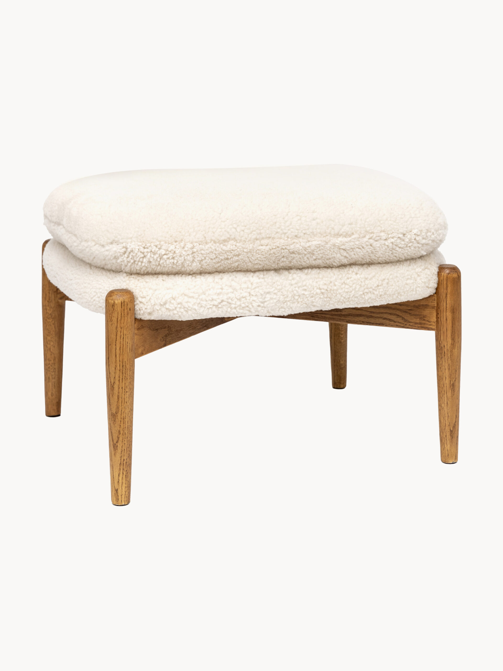 NA LISTĘ ŻYCZEŃNA LIŚCIELuksusowy puf do sofy Datsun z pokryciem z owczej skóry Teddy od Gallery — miękka, puszysta skóra owcza i wypełnienie z pianki tworzą wyjątkowo przytulny i efektowny puf do salonu lub sypialni.