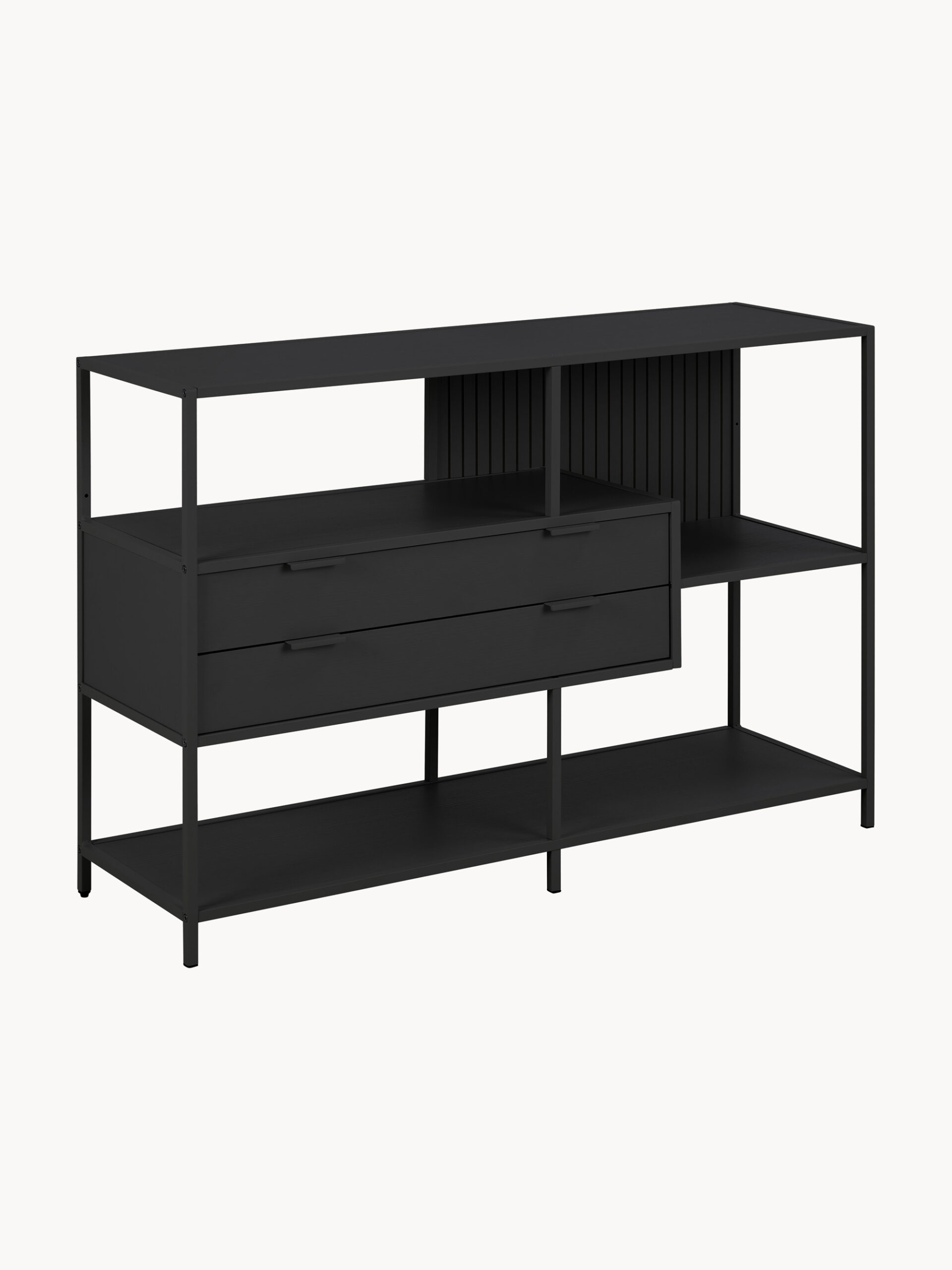 Seaford to stylowy regał o konstrukcji z czarnego metalu, wyposażony w dwie funkcjonalne szuflady oraz asymetryczny układ półek. Jego surowy, industrialny design wzbogacony o ryflowane detale sprawia, że jest to mebel idealnie pasujący do nowoczesnych salonów i pracowni.