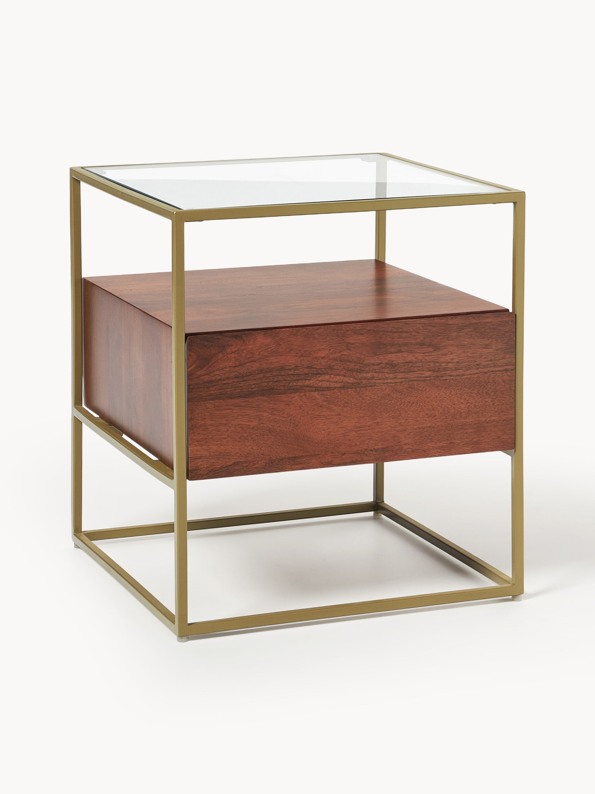| Materiały | Blat stołu: Szkło Szuflada: lite drewno mangowe, lakierowane Stelaż: metal malowany proszkowo |
