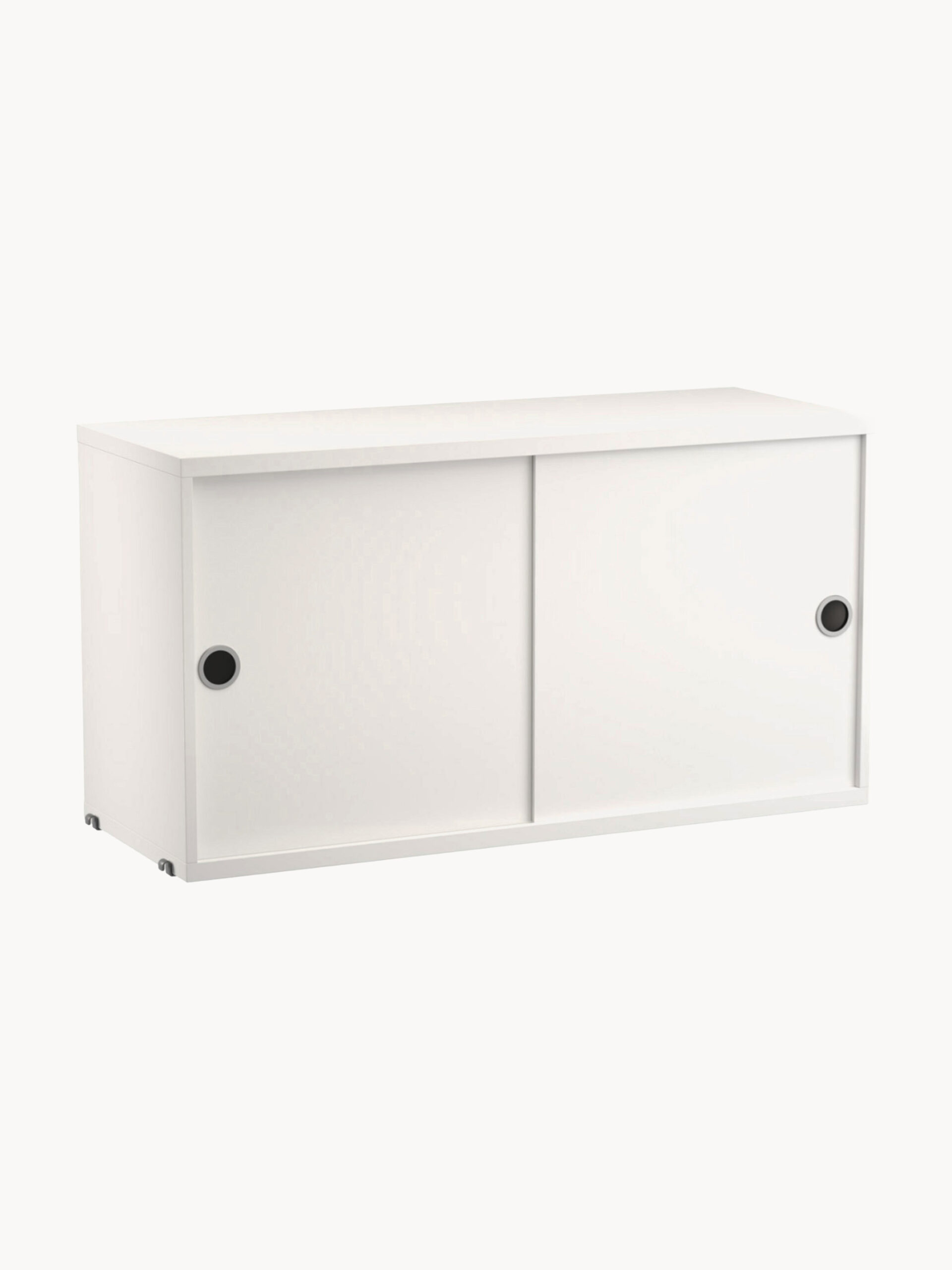 Elegancka szafka String System z drzwiami przesuwnymi z lakierowanej płyty MDF od String — wymiary 78 x 30 cm i drzwi przesuwne tworzą zamknięty, elegancki moduł z ukrytą przestrzenią do przechowywania.