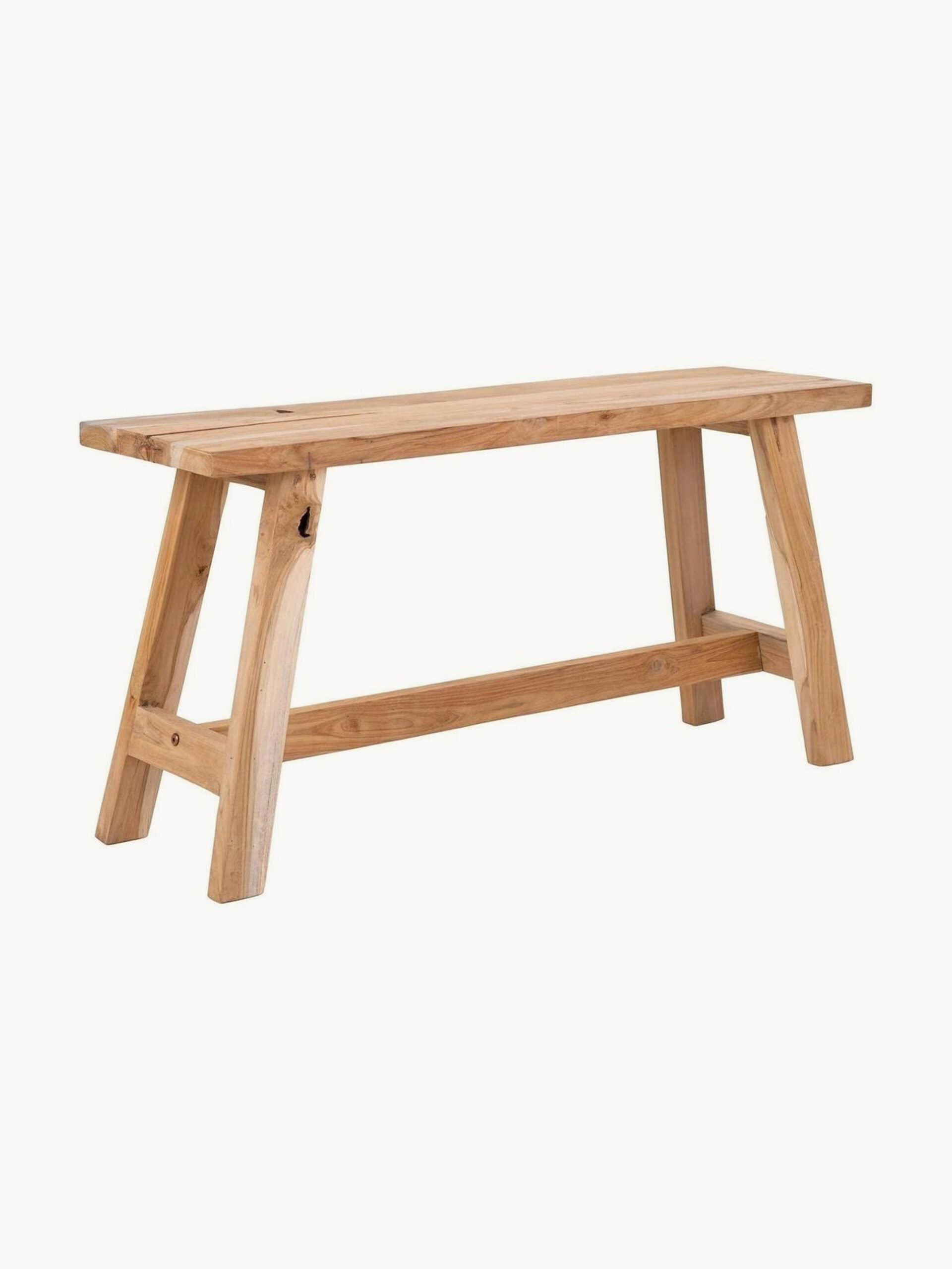 Naturalna tekowa ławka Barcelona z drewna tekowego z Indonezji od Westwing Collection — solidne drewno tekowe z Indonezji i zwarta forma 50 x 45 cm tworzą trwałą i naturalną ławkę do sypialni lub salonu.