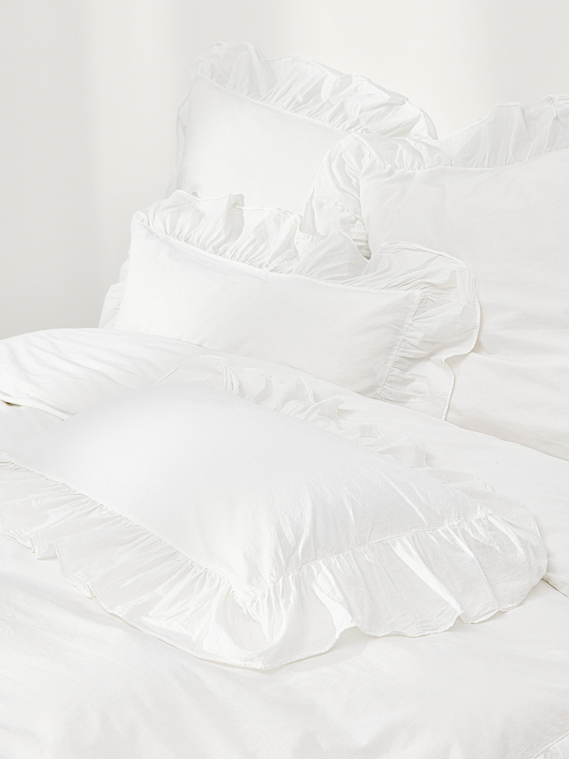 Pościel z pranej bawełny perkalowej Louane to Twoja codzienna dawka luksusu, łącząca niezwykłą miękkość z trwałością. Delikatne falbanki dodają romantycznego uroku, a naturalne włókna bawełny zapewniają przewiewność i komfort przez cały rok.