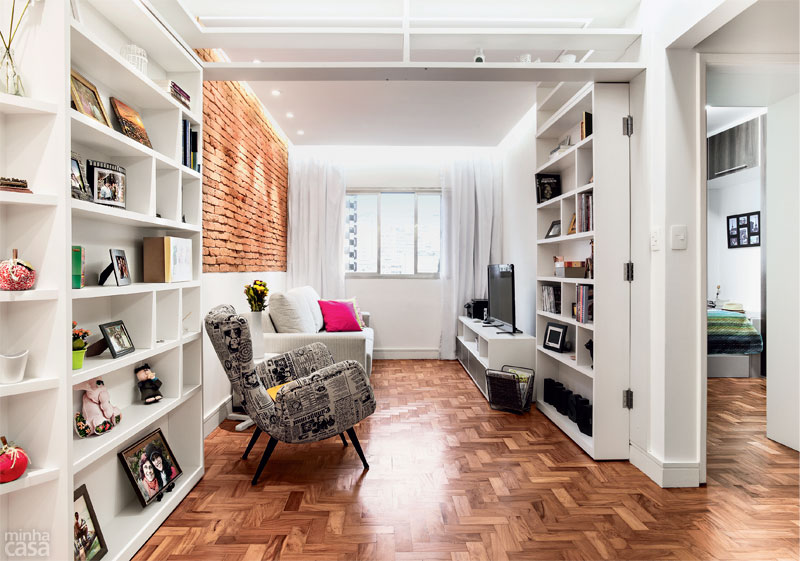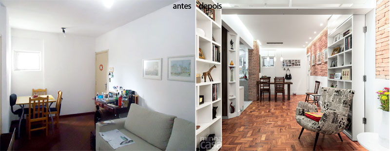Spójrzmy teraz na drugą stronę wąskiego pomieszczenia – i jak? Mieszkanie przed remontem wygląda mi na jakąś studencką kwaterę albo powiedzmy, zwyczajny nieco pusty dom, w którym nie przywiązywano żadnej wagi do roli dekoracji czy chociażby samego wykończenia wnętrza. Każde pomieszczenie mieściło niezbędne przedmioty – stół, krzesła, kanapę – i tylko to! Po zadziwiające metamorfozie aranżację uzupełniono czerwonymi cegłami, stylowymi meblami, intrygującym parkietem oraz ciekawym oświetleniem i mamy mieszkanie nie do poznania 🙂